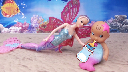 芭比美人鱼捡到一个美人鱼宝宝,喂她喝