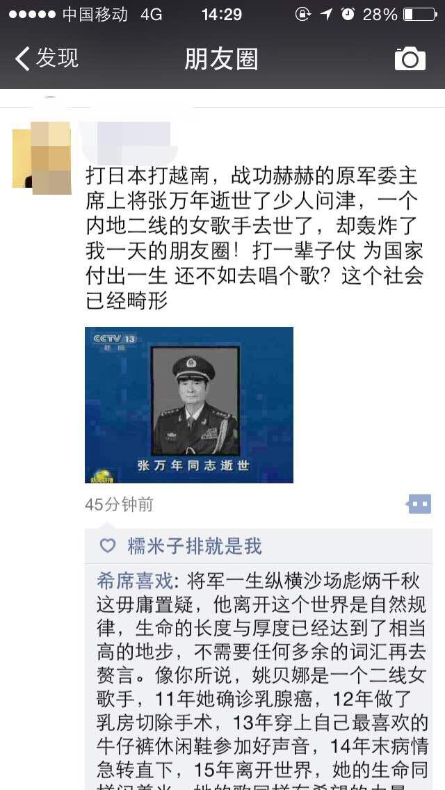 歌手姚贝娜和将军张万年同日去世不同的待遇