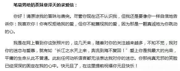 答: 一个人的网名,给奶茶妹章泽天写了个求爱信,于是俩人都红了