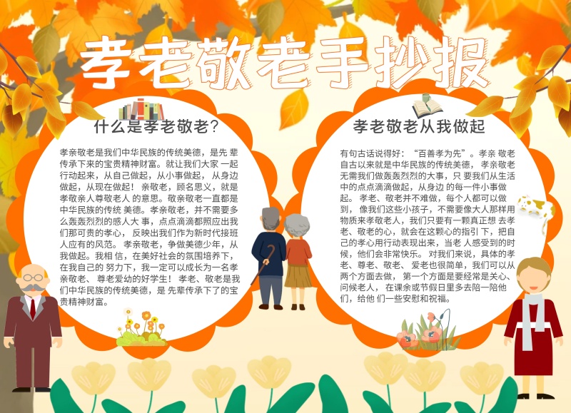 孝老敬老教育橘色卡通简约手抄报