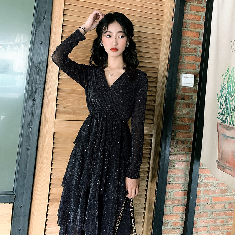 嫦姿亮星仙女裙性感黑色V领连衣裙蛋糕裙