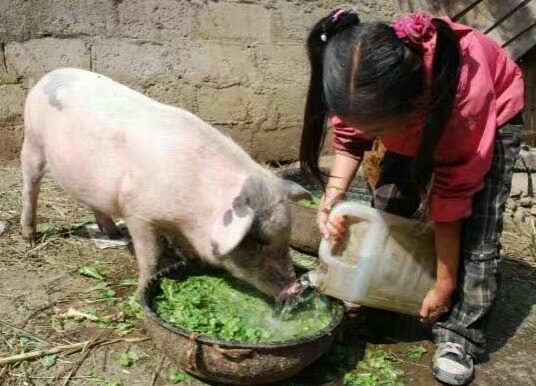 猪下崽后,农妇在猪食中加辣椒粉给母猪吃,