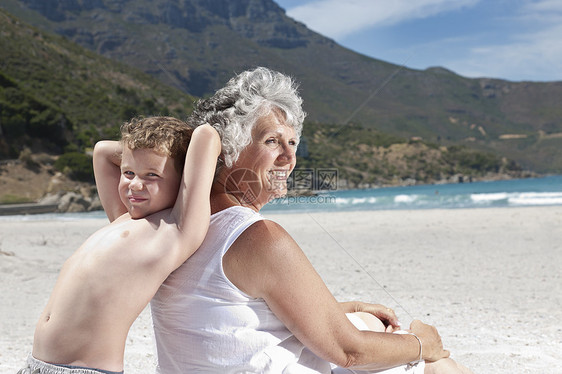 老太太和孙子在海滩上