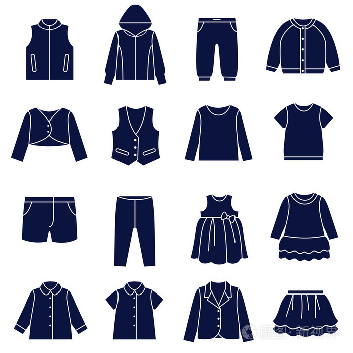 不同种类的服装卡通, 黑色, 平面, 单色, 轮廓