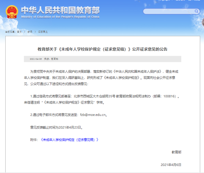 《未成年人学校保护规定征求意见稿》公开