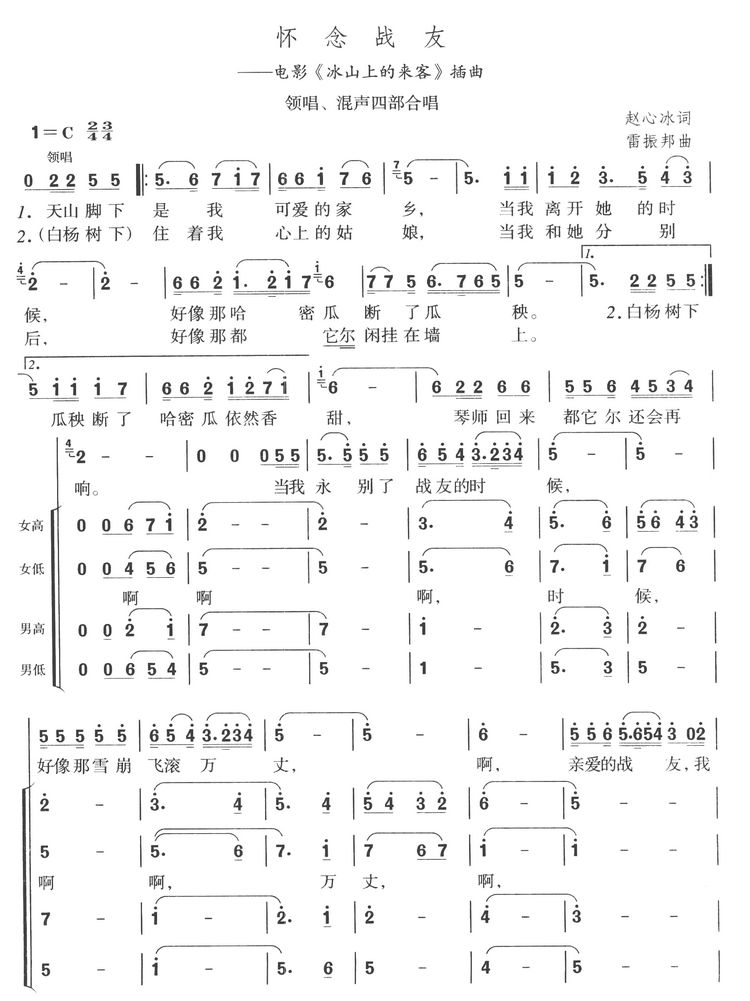 怀念战友(领唱混声四部合唱) 简谱-虫虫吉他