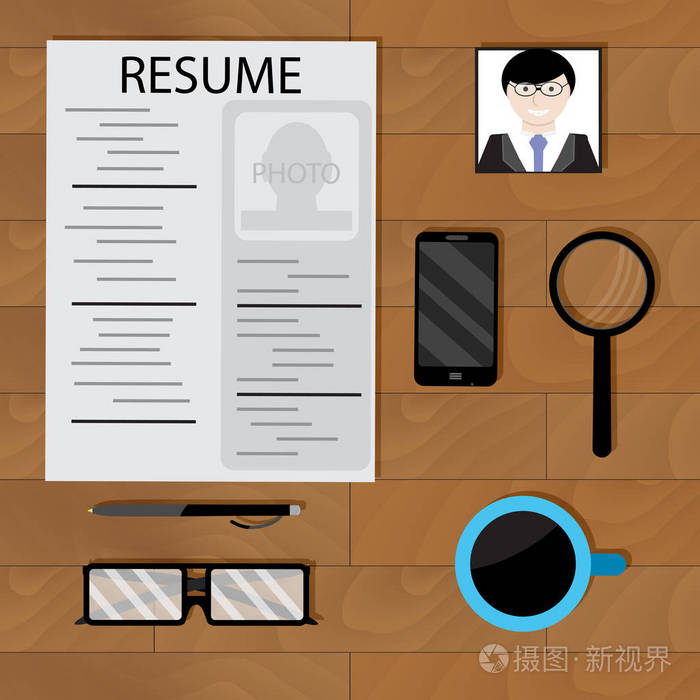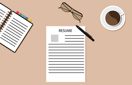 在课桌上写简历、 眼镜、 块、 笔、 纸和咖啡