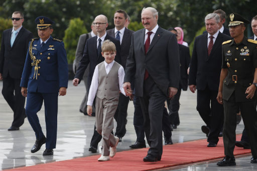 白俄罗斯总统卢卡申科手牵儿子在首都明斯克