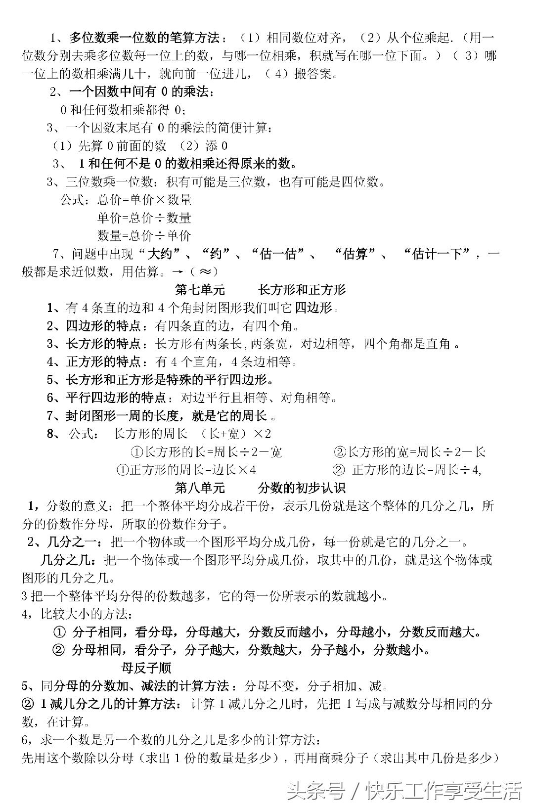 人教版三年级数学上册知识点归纳(1-8单元)