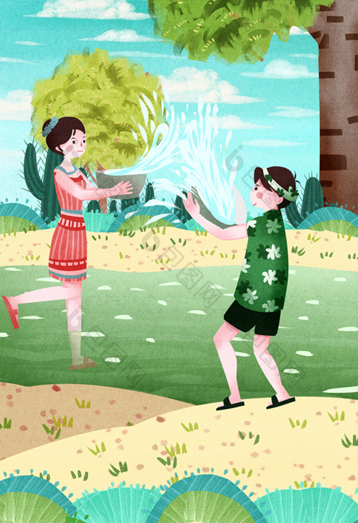 小清新泼水节傣族泼水插画