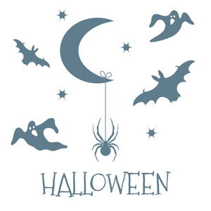 万圣节2019矢量插图与月, 星, 蜘蛛, 蝙蝠,