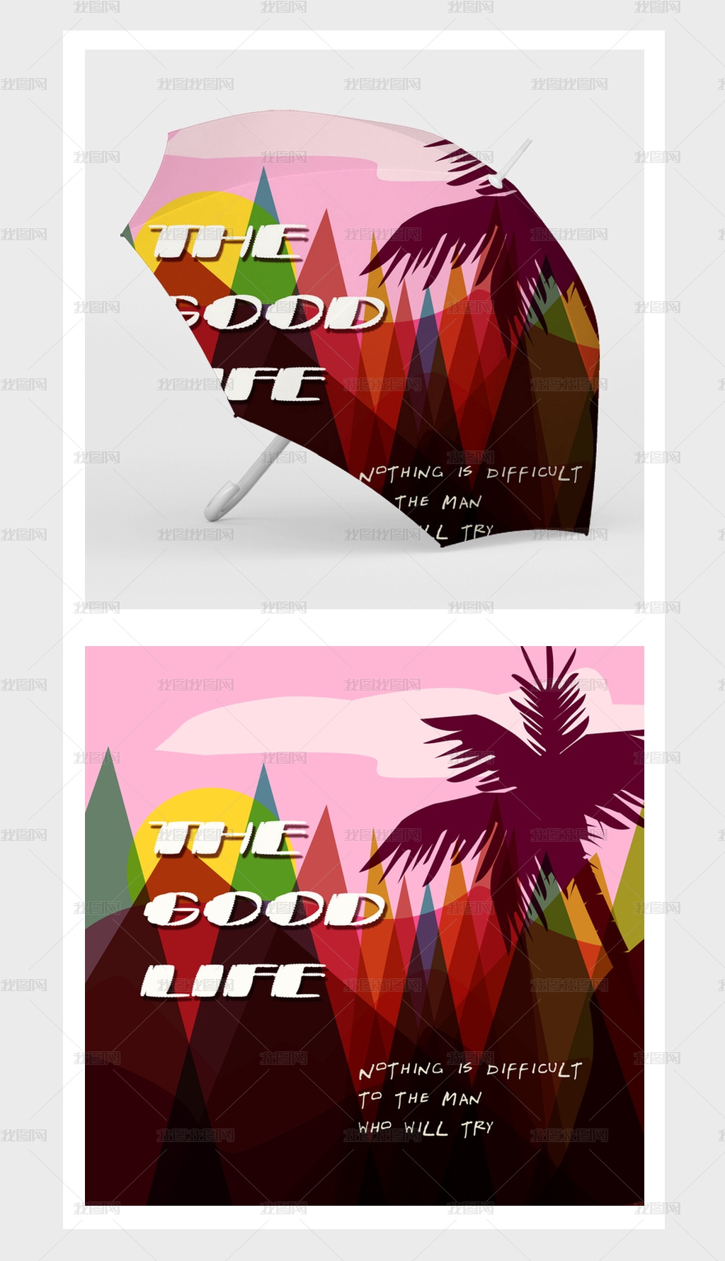 粉红的椰子树与几何英文字母变形拼接的撞击