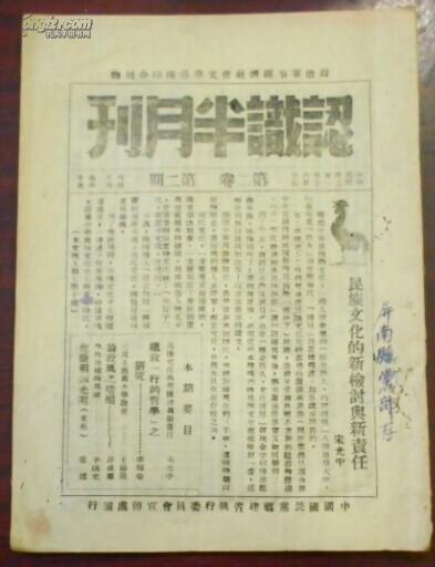 民国三十二年一月十六日出版《认识半月刊》第二卷第二期(民族文化的新检讨与新责任、总裁‘行的哲学’之研究、三民主义与大学教育、论政风之培植、平均地权的真谛、从微明到光明…)