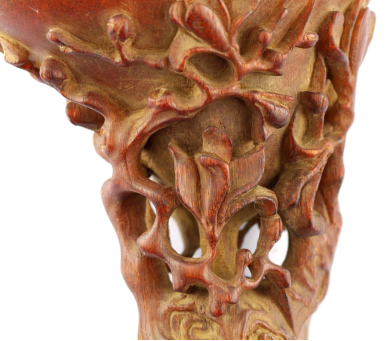 罕见的犀角雕刻艺术 犀角的雕刻和象牙的雕刻大致差不多。值得一提的是犀角在盐水中煮软后可以用手扳动。有些犀角雕复杂的造型便是靠手工扳而形成的。