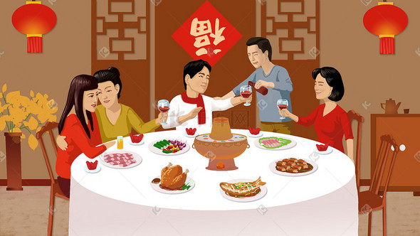 新春佳节年夜饭同事欢聚一堂插画图片