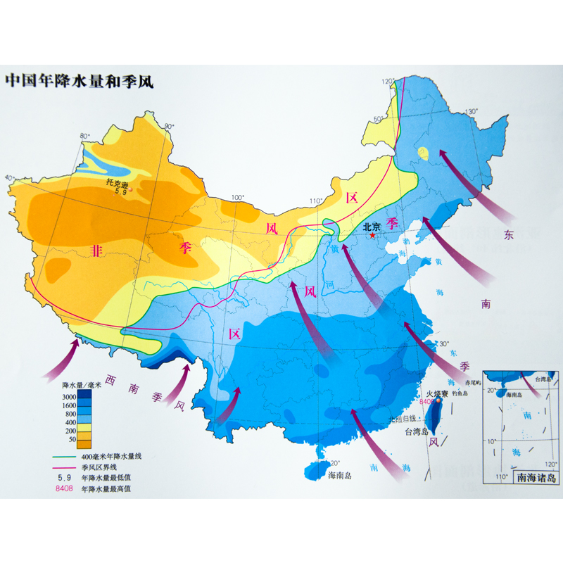 读“中国气候类型分布图 .回答下列问题.(1)图中A.C分别表示 . .主要受地形因素影响而形成的气候类型是 .(2)图中B.C之间的地理分界线是 .(3)与乙地区相比.甲.丙两地区农业发展的主要限制性因素分别是 . . 题目和参考答案