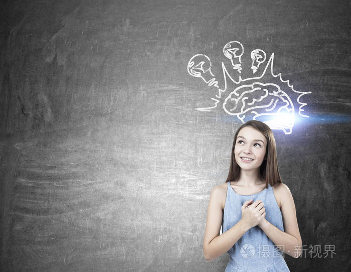梦幻般的青少年女孩,用手靠近心脏,大脑灯泡