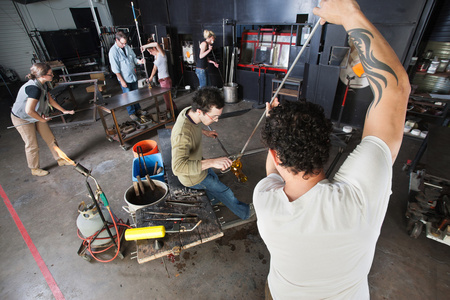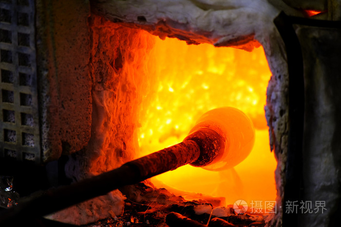 一个吹玻璃的人在他的吹管上做了大量的熔融玻璃。
