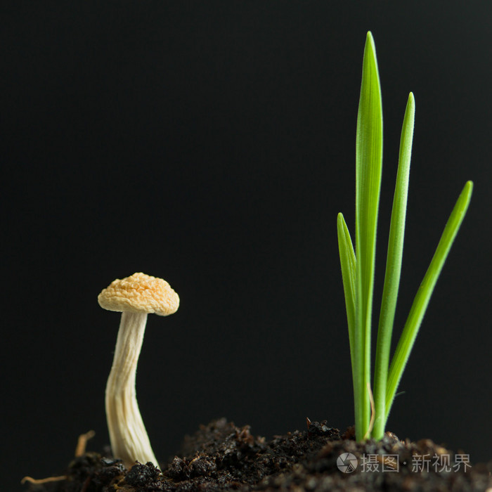 年轻人蘑菇和植物从土壤发芽