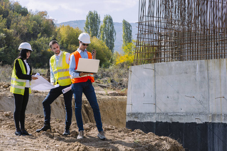 土建工程师处理施工现场文件。黄安全帽