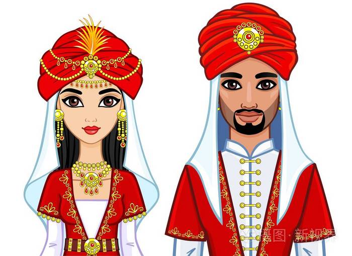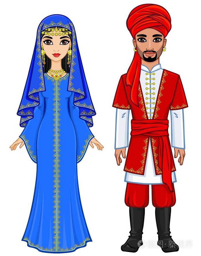 动画肖像的阿拉伯家庭在古老的衣服。