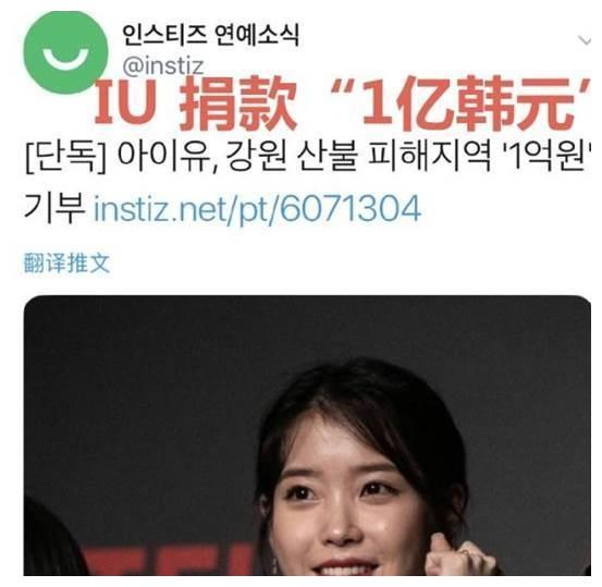 韩国女歌手IU山火受灾地区捐款1亿韩元,