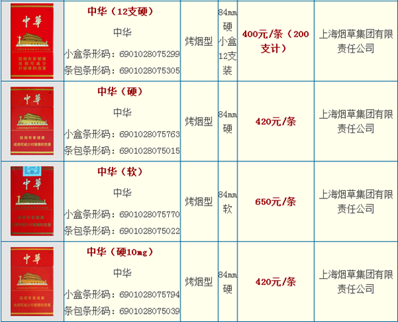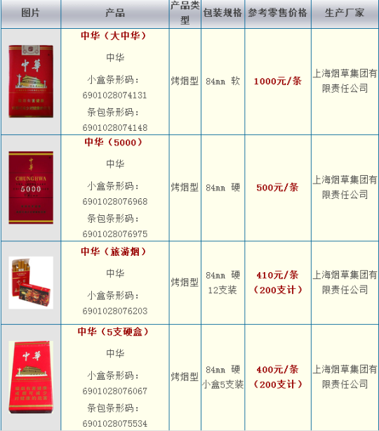 2015年中华烟价格表查询 中华香烟最新价格表图一览表