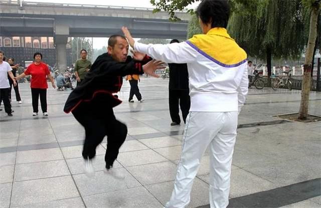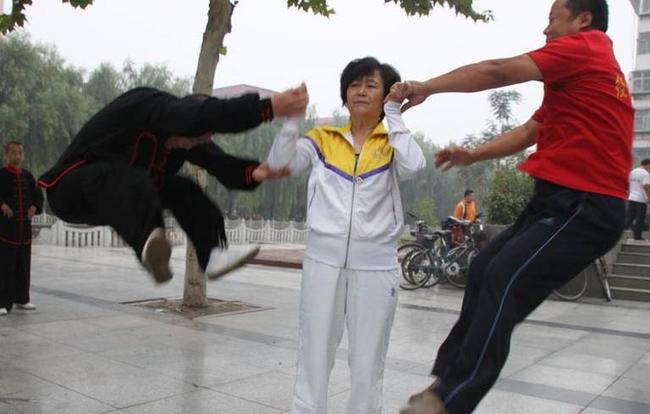 闫芳表演太极凌空劲,弟子上蹿下跳记者