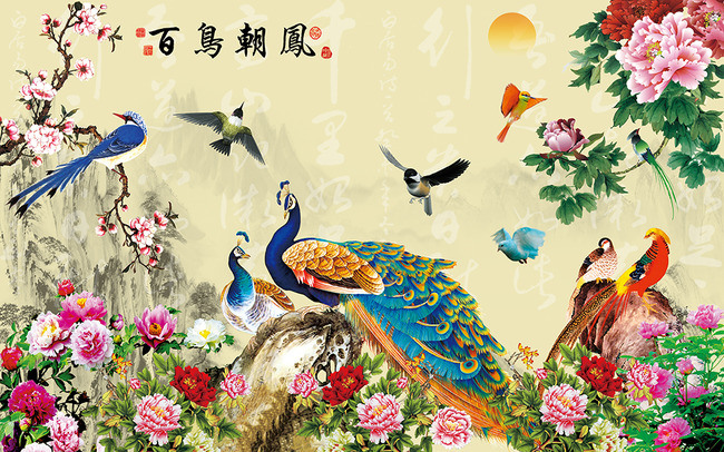 百鸟朝凤孔雀牡丹百鸟图中式电视背景墙