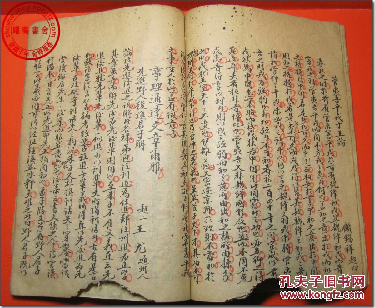 【清朝末年李鹤峰手写批注清代科举选拔考试范文1本】,竹纸,纸绳手工装订册页,32开,尺寸(长宽厚):18.5厘米13.5厘米0.7厘米,共42页,毛笔行楷,共手写批注清代科举考试范文15篇,并作朱黑双墨圈注句读,有的范文还标有作者、籍贯、等级名次。