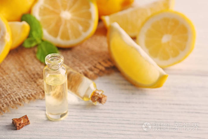 一瓶柠檬精油与新鲜柠檬在 backgro