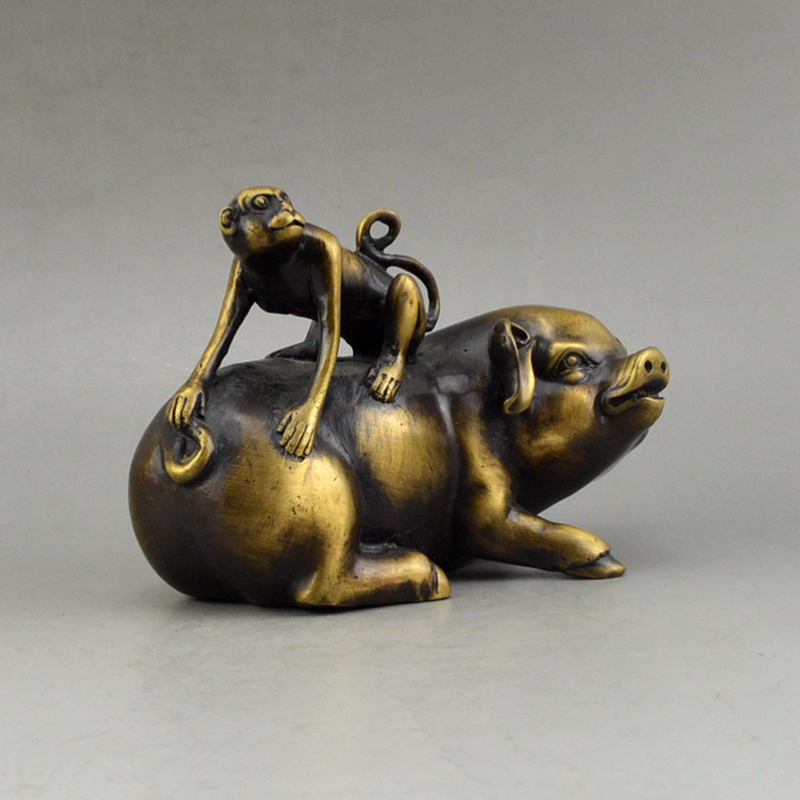 全纯黄铜猪猴摆件诸侯黄铜做旧招财旺官运