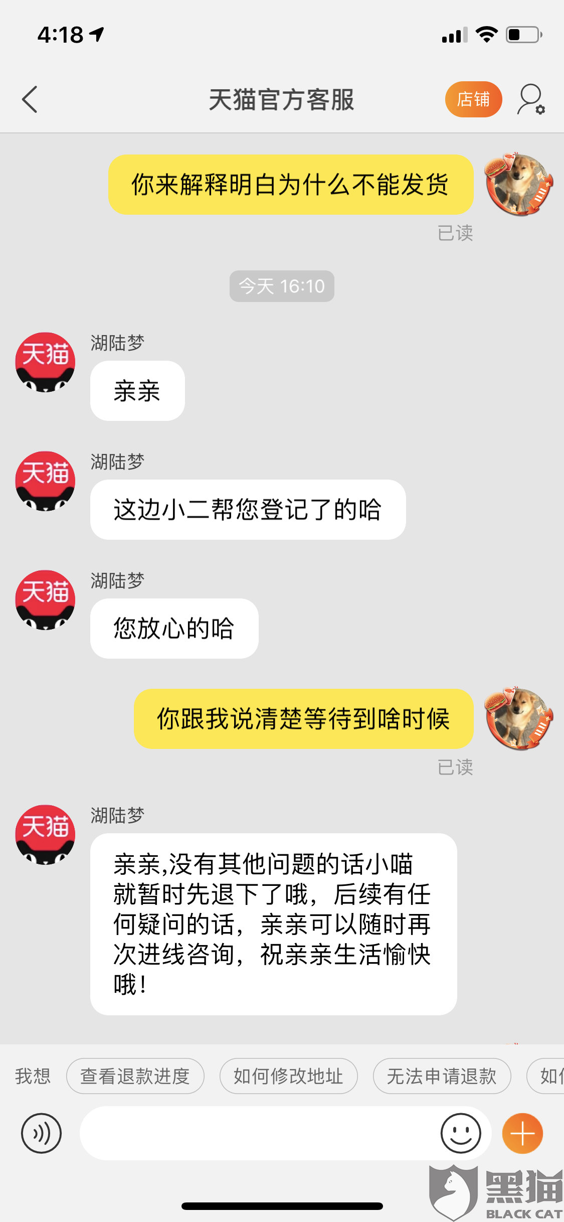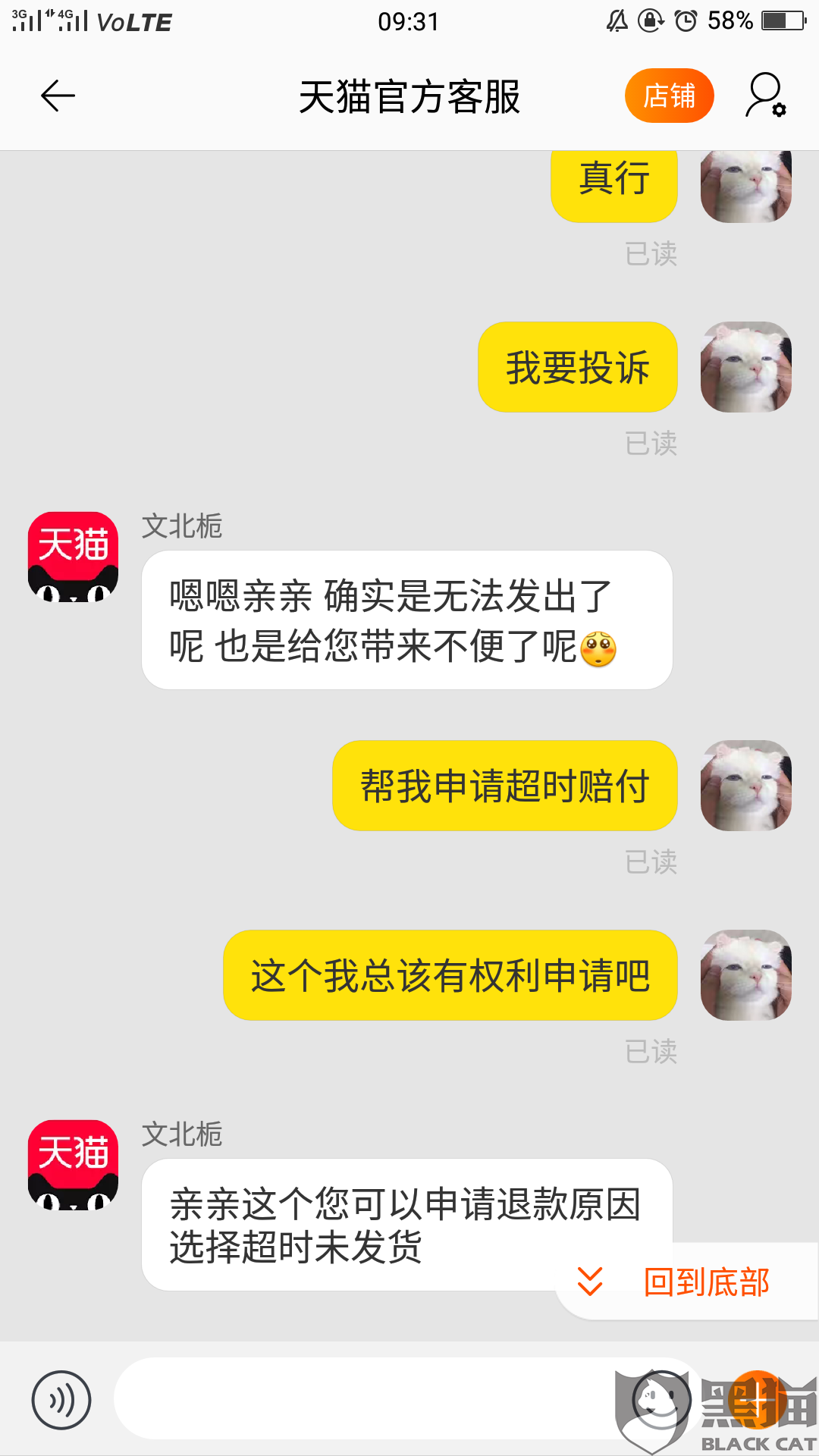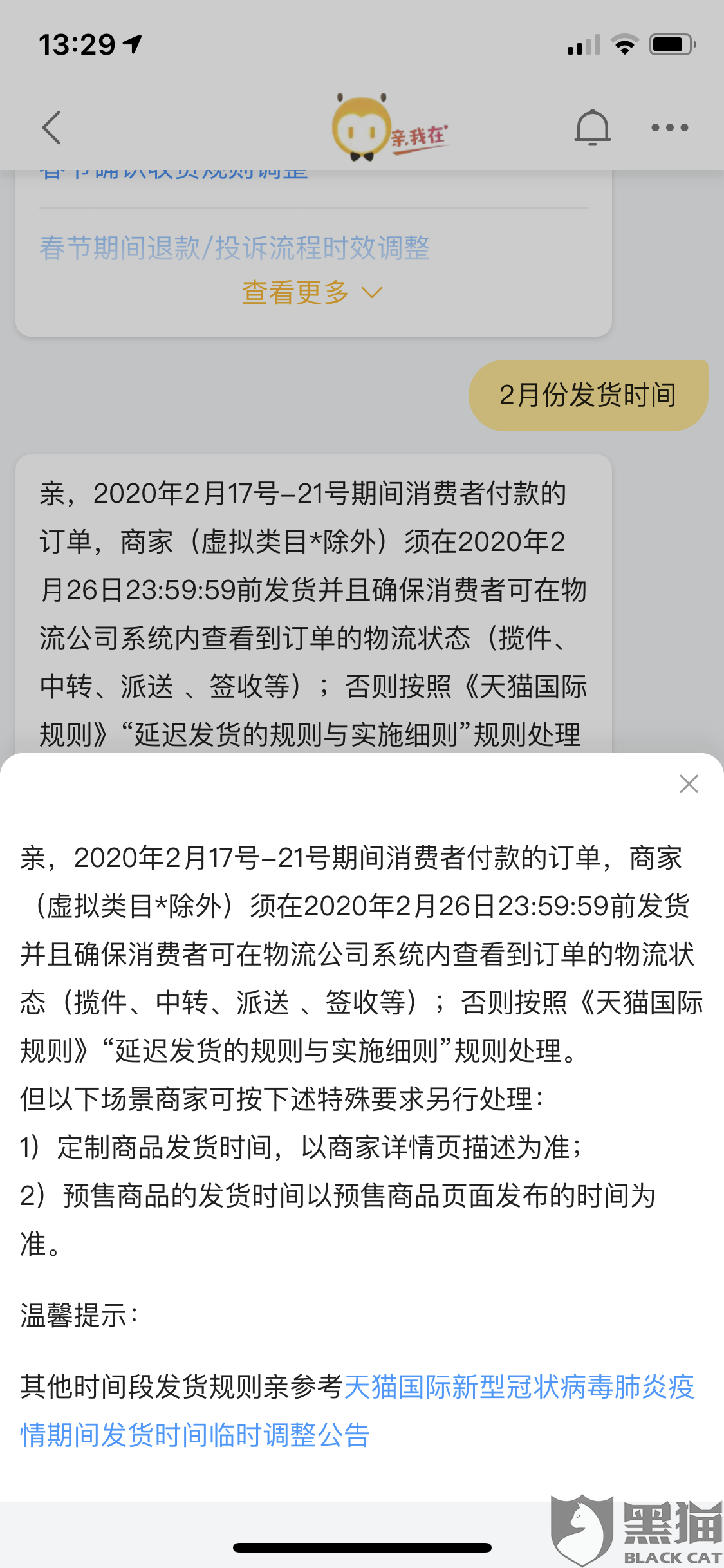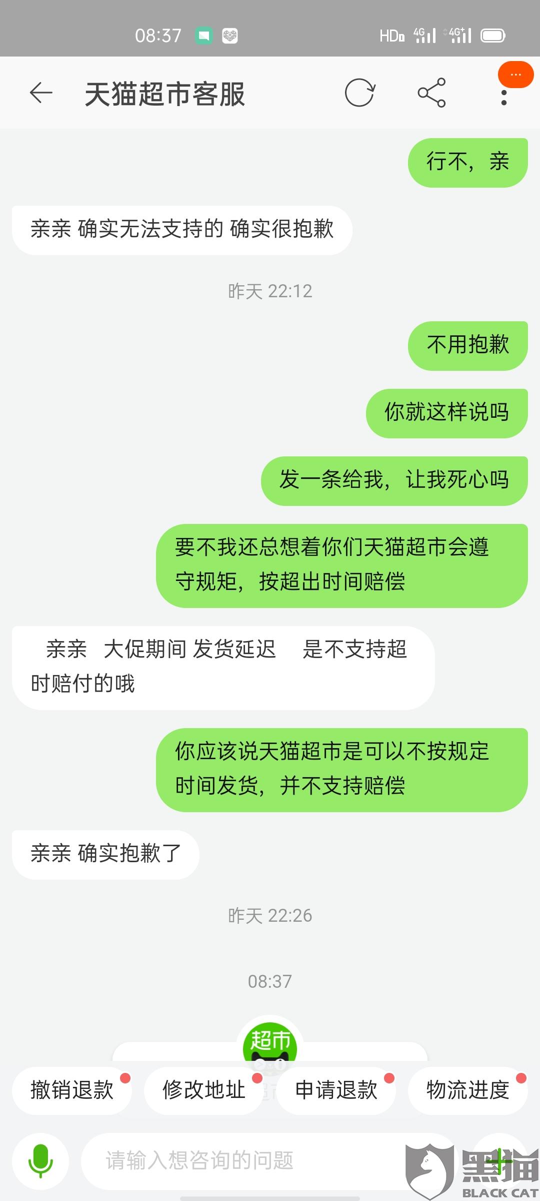 黑猫投诉:天猫超市未按规定时间发货,理应