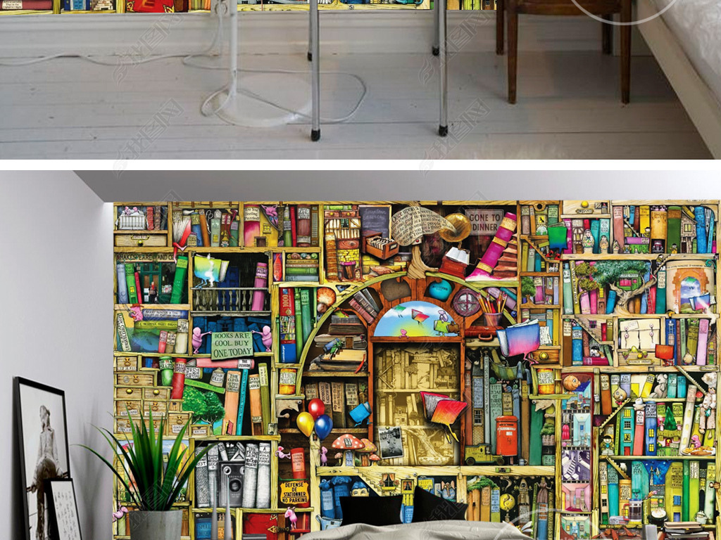 卡通手绘书架书橱儿童房童话壁画背景墙