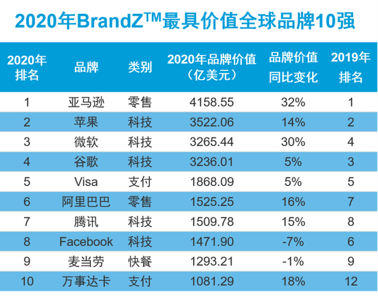 企业:苹果领跑,微软第二,阿里巴巴排名第6