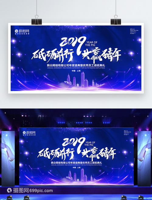 蓝色2019砥砺前行共赢猪年企业年会展板