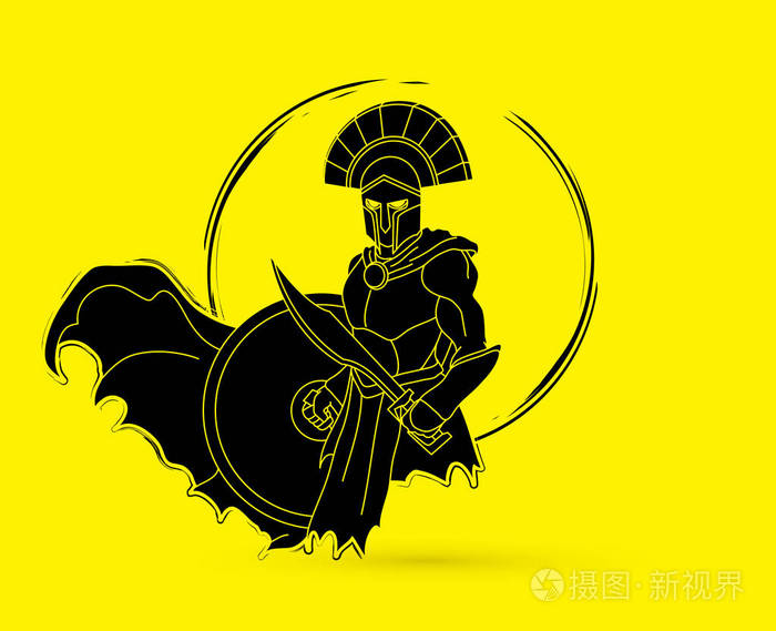 愤怒的斯巴达战士用剑和盾牌图形向量