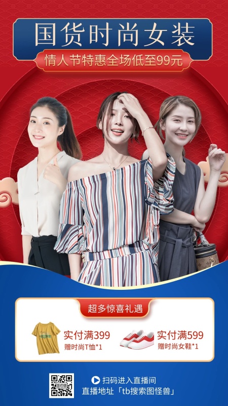 简约红色情人节女装促销直播海报