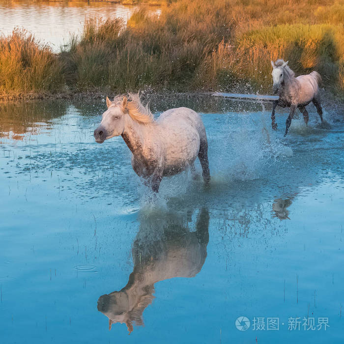 美丽的白马和白驹过隙在水中行走,黄昏的