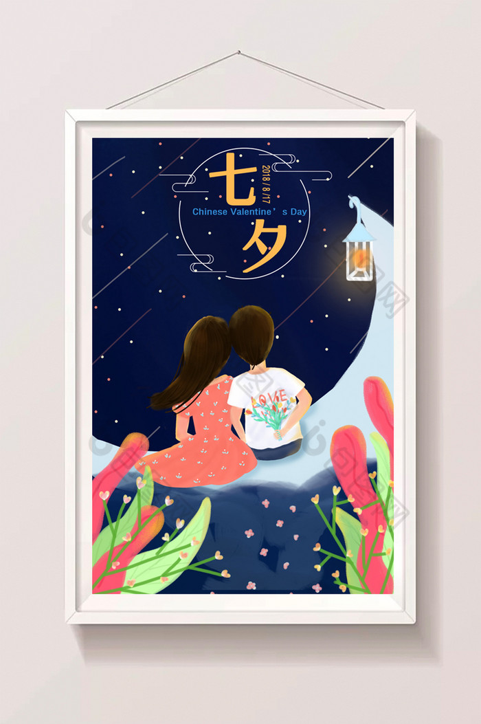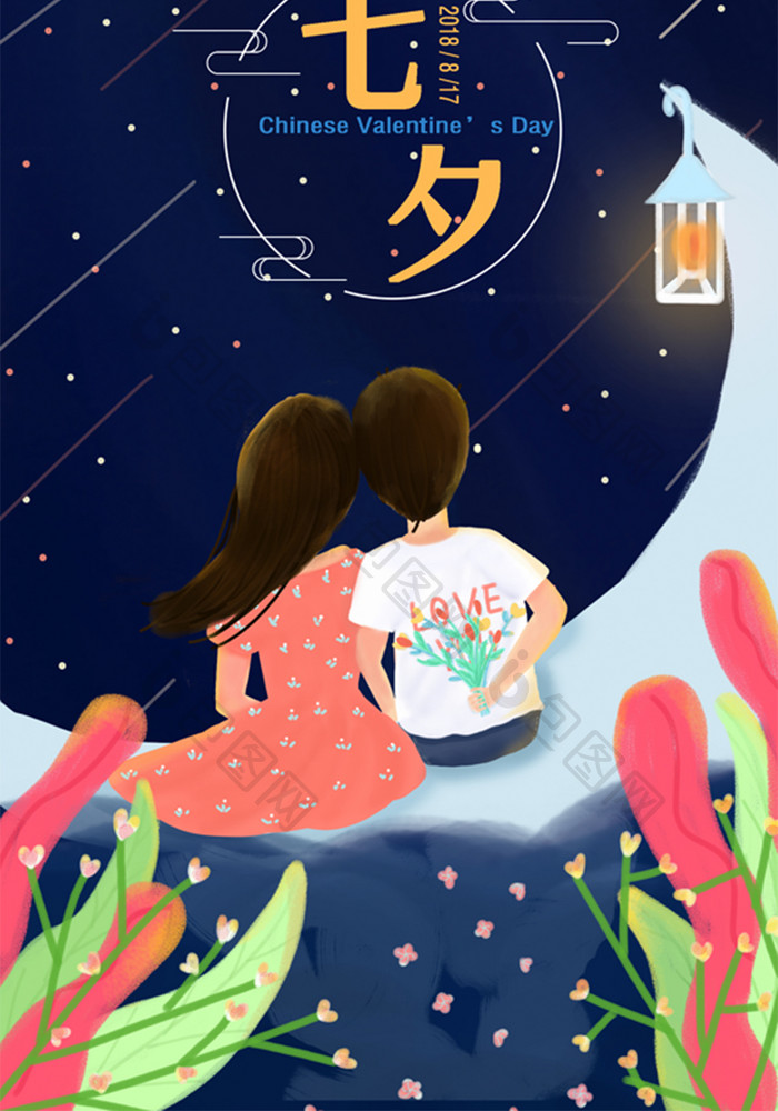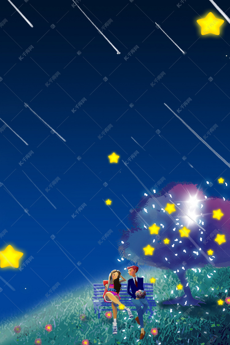 唯美清新节日七夕情人节甜蜜情侣看流星插画
