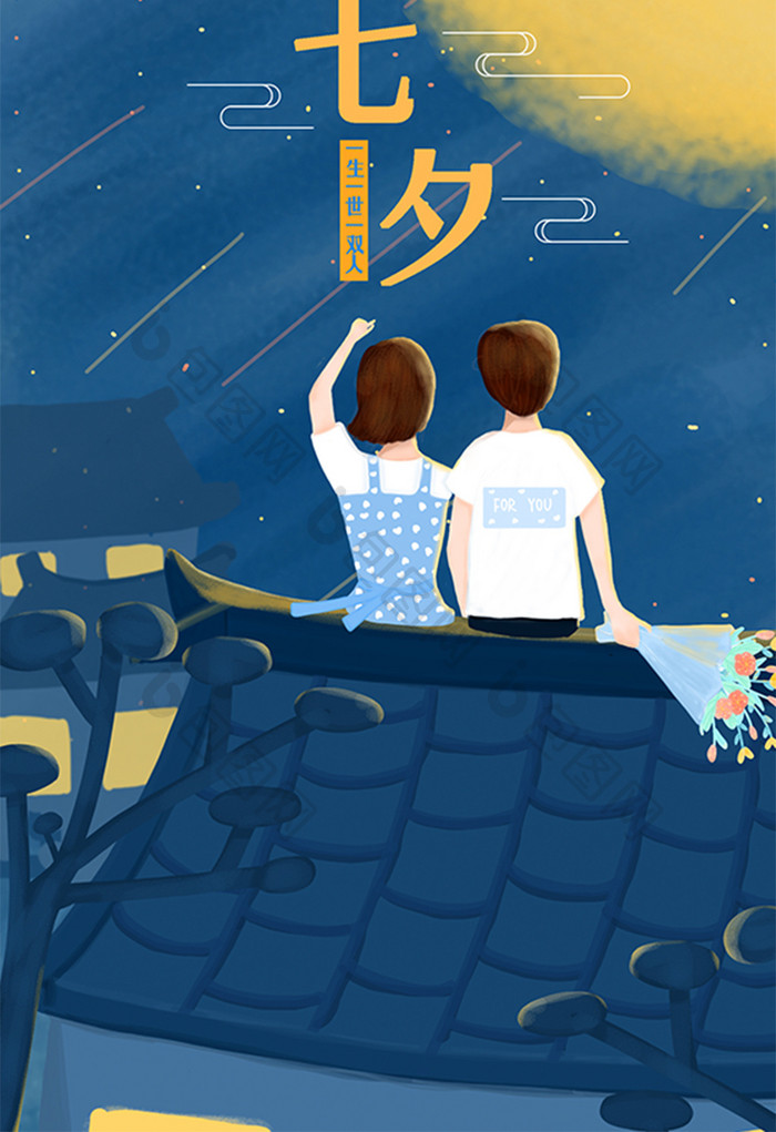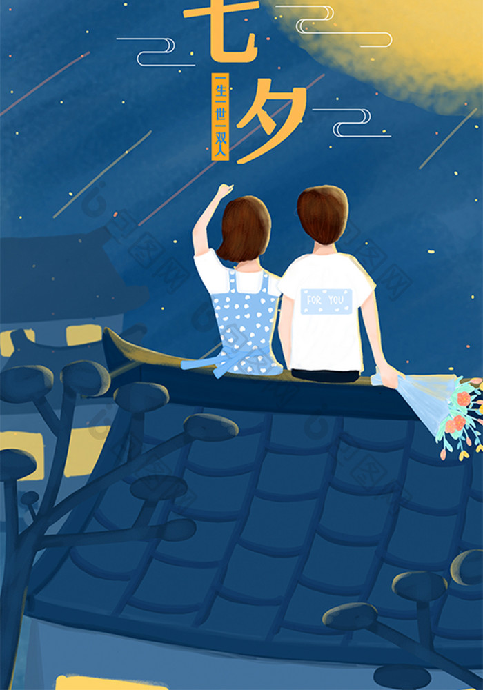 温馨节日中国情人节七夕情侣房顶看流星插画