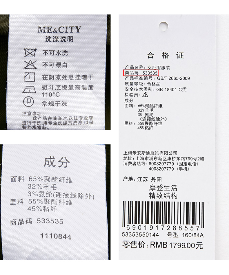 ITY洗涤说明不可水洗格证不可漂白产品名称服