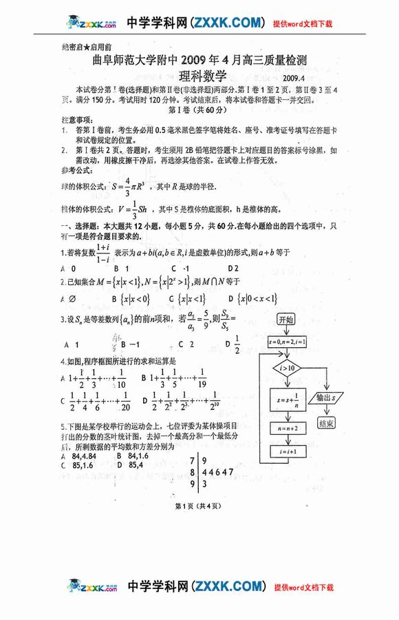 山东曲师大附中09届四月质检-理数--人民网