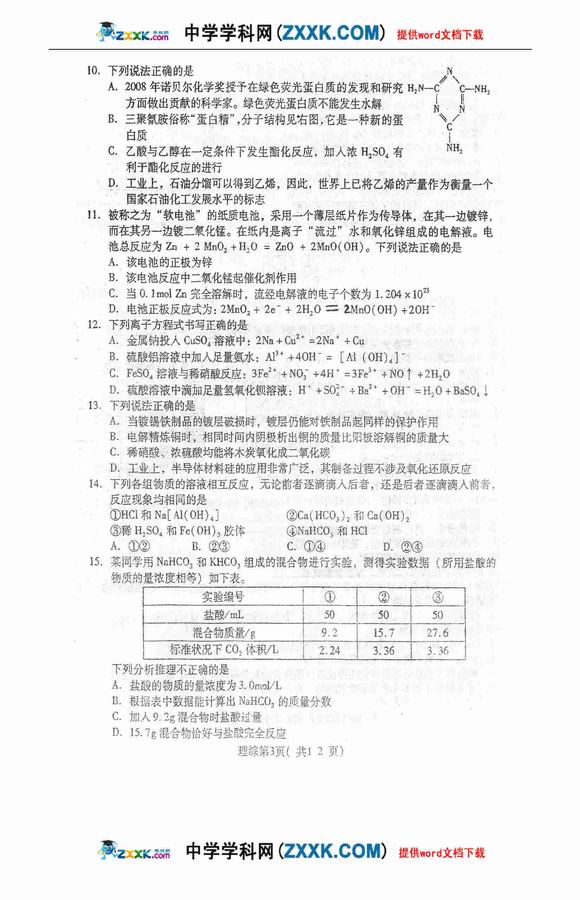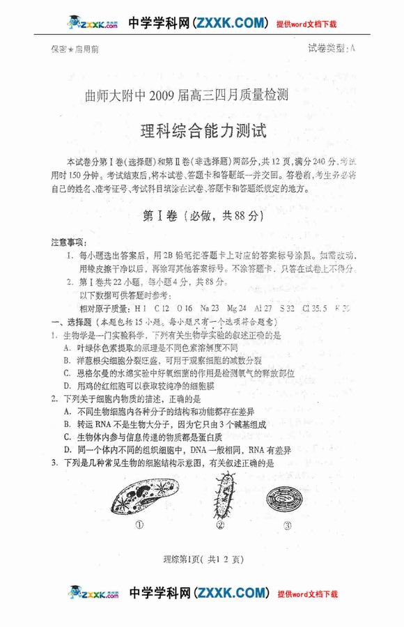 曲师大附中09届四月质检-理综 (3)--人民网
