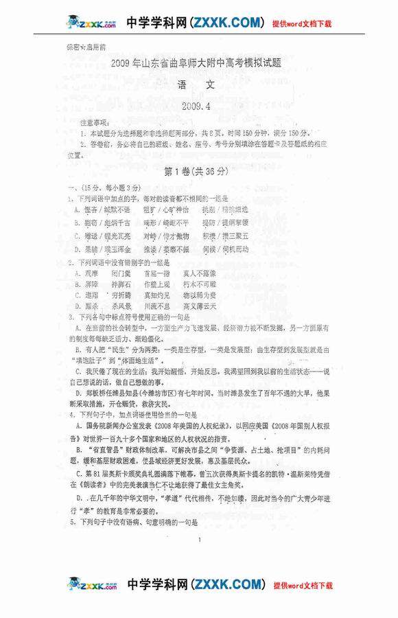 山东曲师大附中09届四月质检-语文--人民网
