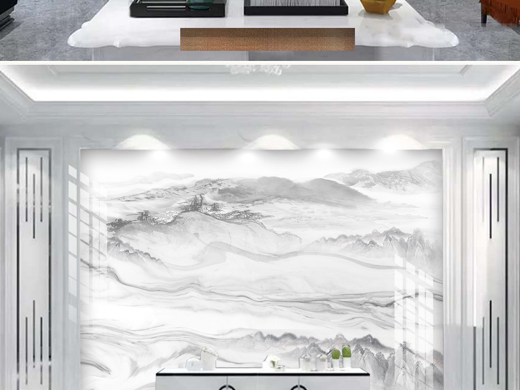 高清天然大理石纹爵士白新中式山水背景墙