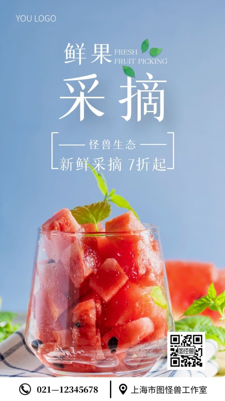 鲜果采摘简约蓝色摄影图海报