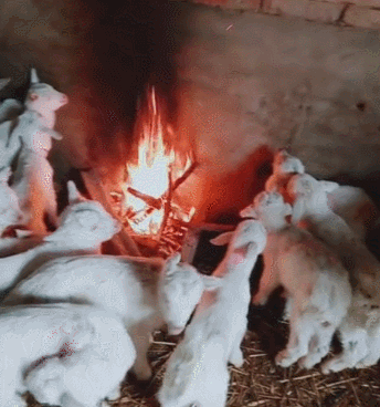 自从主人放一把火,羊羔们火堆边取暖,真怕