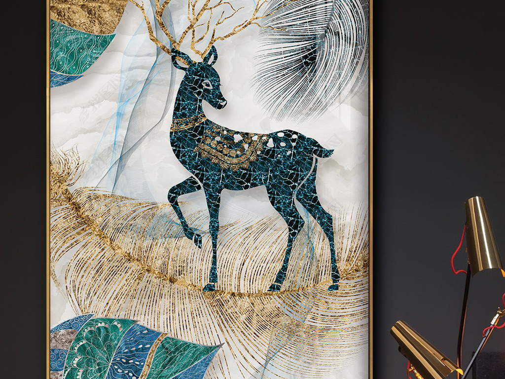 新中式金色羽毛麋鹿创意叶子玄关装饰画