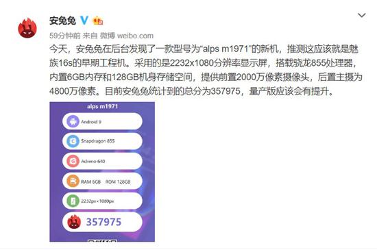 魅族16S手机确认:安兔兔跑分高达357975